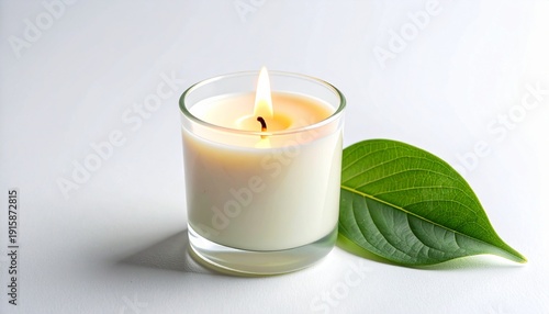 candle, glasses, leaf, lit, white, relaxation, calm, serenity, peaceful, aroma, spa, meditation, soothing, flames, wax, container, green, nature, simple, minimalist