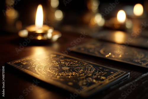 candlelight, glow, illumination, shadow, mysticism, cosy, twilight, divination, spirituality, wooden table, fortune-telling, light, darkness, design, mysterious, ambience, ritual, magic, symbol, warm, intimate, enchanting, flickering, reflections, gold, meditation, introspection, soft light, still life, calm, serene, evening, tabletop, ancient, oracle, cosiness, calmness, dreamlike, communication, exploration, connection