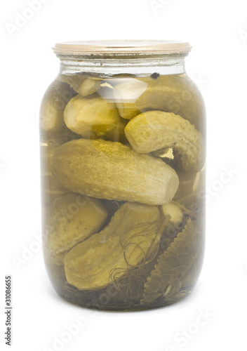 isolated, white, background, vegetable, meal, food, delicious, healthy, useful, cucumber, green, whole, salt, pickled, canned, jar, lid, tableware, container, glasses, domestic, preservation