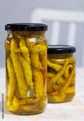 Canned green chili peppers in jar