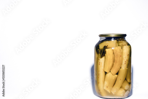 Canned pickles cucumber in glass jars. Pickle marinade cucumber in a jar. Jar with pickled gherkins on white background