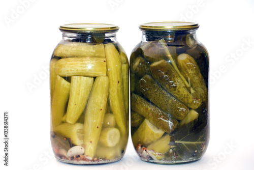 Canned pickles cucumber in glass jars. Pickle marinade cucumber in a jar. Jar with pickled gherkins on white background