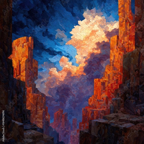 Canyon cliffs like Tetris blocks beneath radiant skies