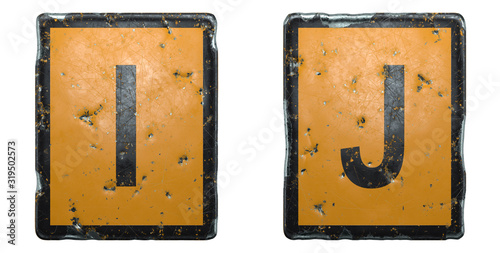 Capital letter set I, J made of public road sign orange and black color on white background. 3d