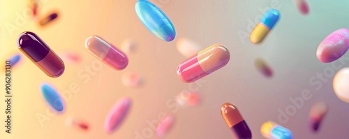 Capsules of various colors floating midair against a soft gradient background, creating a sense of movement