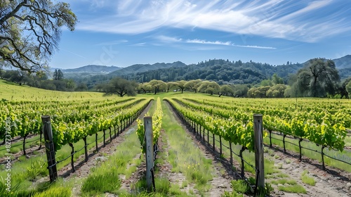 Captivating Beauty: A Serene Vineyard Landscape, Where Vines Stretch into the Horizon, Bathed in Golden Sunlight, Inviting Tranquility and Wine-Lovers Alike.
