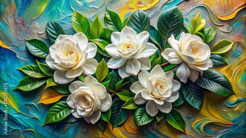 Captivating Gardenia Floral Impasto Painting with Thick Brush Strokes, Showcasing White Flowers and Vibrant Colors in a Textured 3D Style for Floral Art Lovers