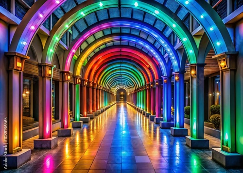 archway, corridor, modern, vibrant, light, architecture, symmetry, colourful, design, photo, low light, interior, contemporary, illumination, space, artistic, depth, ambience, urban, pattern, structure, aesthetic, visual, shadow, elegance, creative, atmosphere, unique, perspective, line, geometry, warm, cool, reflections, style, allure, enchanting, pathway, calmness, enticing, inviting, exploration, beauty, harmony, high-coloured, contrasting, brilliant, tone