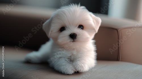 Captivating portrait of a playful puppy with sparkling eyes and fluffy white fur relaxing on a cozy sofa, showcasing innocence and charm in stunning detail