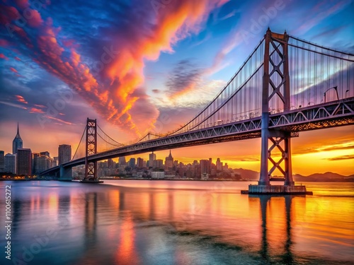 Captivating Sunset Over the Oakland Bay Bridge in San Francisco with Glorious Colors Reflecting on Water and City Skyline, Perfectly Framed by the Rule of Thirds