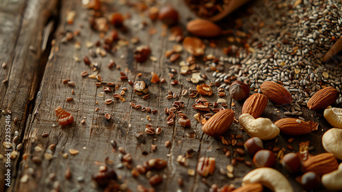 Capture a close-up of a variety of nuts and seeds scattered on a rustic wooden surface