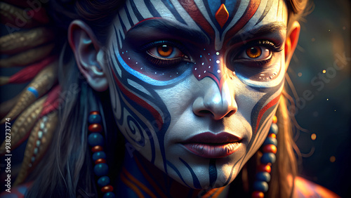 portrait, woman, face, paint, closeup, vibrant, colours, intricate, make-up, artistic, beauty, female, detailed, expression, skin, design, creative, bold, modern, high-coloured, fashion, style, glamourous, traditional, culture, eye, bright, photo, head shot, visual, cosmetic, stunning, elegant, accessory, image, model, striking, portraiture, aesthetic, trendy, boldness, chic, flawless