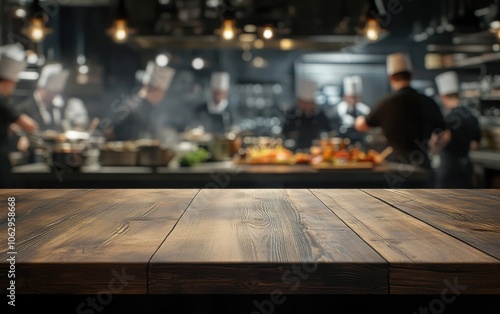 Capture a high-resolution photo of a bustling restaurant kitchen, where chefs are actively preparing dishes on wooden tables.