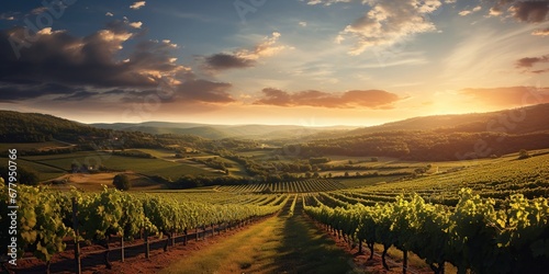 Capture a picturesque vineyard at sunset—a rolling landscape of vine-covered hills, a rustic winery, elegance, fine wine allure
