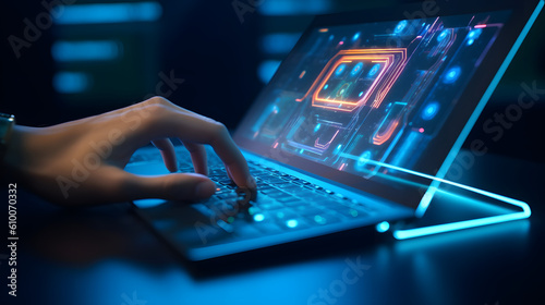 Capture the sleek and modern vision of a person's hands typing on a futuristic laptop with a holographic display, illuminated keys, and a minimalist design, evoking a sense of technology and productiv