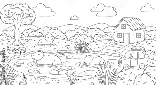 Capybara animals children’s coloring book illustration. Perfect for kids to color and enjoy, adding a splash of creativity to their day