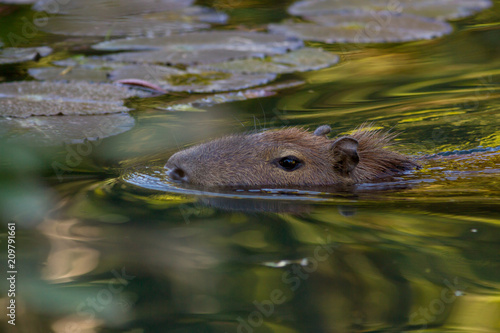 Capybara (biggest rodent in the world) swimming passing waterlillies leafs