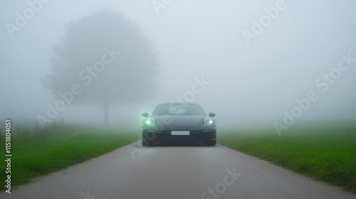 Car Driving on a Foggy Country Road with Low Visibility and Blurred Surroundings, Emphasizing Atmospheric Haze and Driving Safety Challenges in Rural Areas