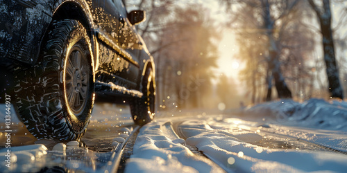 Car driving on a snowy road during sunset with tire tracks in the snow, capturing the serene winter landscape and warm glow of the setting sun