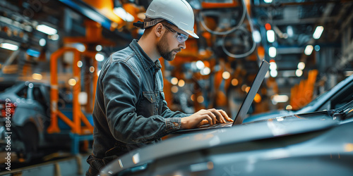 Car Factory Engineer Using Laptop Computer with Software. Working at Automotive Industrial Manufacturing Facility Dedicated for Vehicle Production.