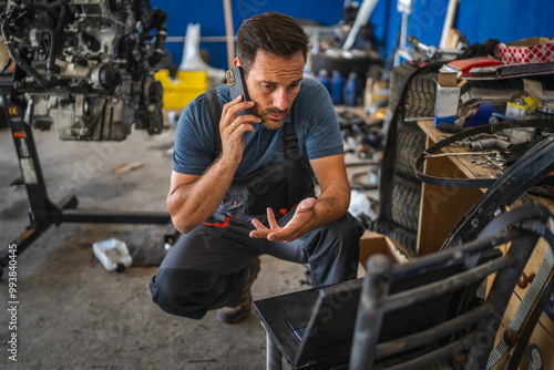 man, adult, mechanic, laptop, mobile phone, phone call, phone, garage, multitask, technology, working, modern, communication, efficiency, productivity, sharpened, determination, dedication, tool, engine, car, vehicle, workshop, engineering, problem solving, innovation, professional, expertise, concentration, workspace, craftsmanship, digital, connected, industry, occupation, automotive, routine, conversation, blue-collar, male, 1, copy space, caucasian