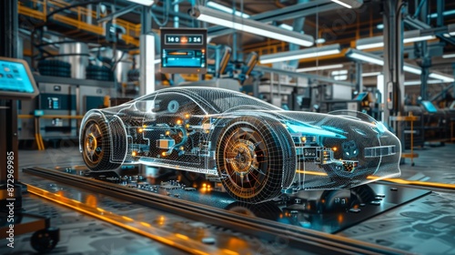 car of the future concept, virtual hologram of a car at a car factory, sketch of a future project, preparation for production