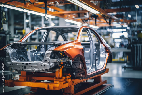 Car production line. Assembling a car on a conveyor belt. Close-up of a car body. Automotive industry Interior of a high-tech factory, modern production.
