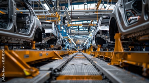 Car production line with cars in different stages of the innovative manufacturing process in a modern car factory