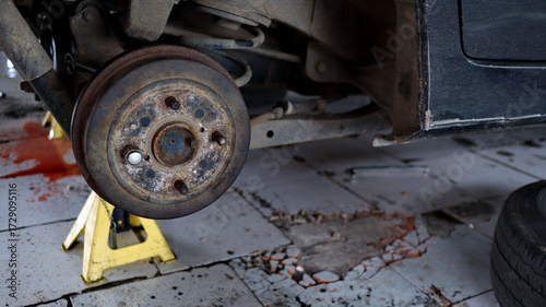 car, auto, repair, shop, jack, stand, wheel, removed, brake, maintenance, automotive, vehicle, service, garage, mechanic, transportation, industry, metal, equipment, engineering, technology, rust-eaten, dirty, old, part, system, component, automobile, broken, fix, substitution, auto mechanic, repair shop, auto industry, safety