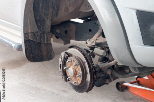 absorber, auto, automobile, automotive, bolt, brake, break, car, change, check, detail, dirty, disc, disc, front, garage, maintenance, mechanic, mechanical, metal, old, part, part, repair, rust, rust-eaten, service, shock, spring, steel, suspension, system, tire, transport, transportation, vehicle, wheel, white
