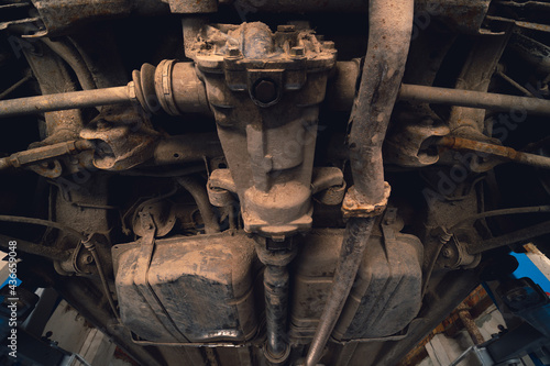 Car underbody front enginee wheels drives suspension of used car. service, exhaust system, catalytic converter, Gas tank, magnetic clutch for 4WD. cardan and differential