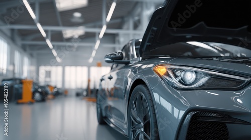 car, vehicle, automobile, hood, open, repair, shop, garage, service, automotive, maintenance, transportation, industry, technology, mechanical, closeup, modern, grey, shiny, day, indoor, nobody, tool, equipment, professional, expertise, diagnostic, inspection, engine, light, detail, sharpened, luxury, machine, metallic, urban, design, studio