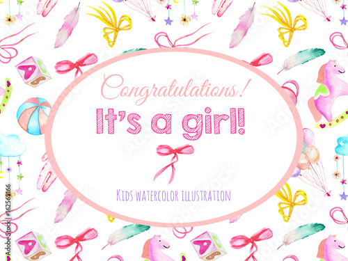 Card template, frame border on baby girl shower watercolor elements background (toys, air balloons, rainbow, nipple, feathers and other)