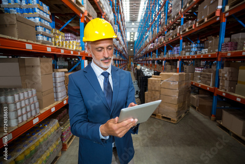 warehouse, cardboard, pallet, logistic, industrial, construction, safety, management, organisation, robotic, senior, man, business suit, blue tie, tablet, inventory, inspecting, reviewing, storage, shelf, shelving, orange, blue, cardboard box, wrapped, plastic, aisle, roomy, bottle, can, good, professional, adult, single, standing, holding