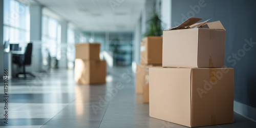 Cardboard boxes stacked in a spacious modern office hallway, symbolizing relocation and transition