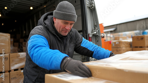 Careful Driver Unloading Fragile Packages from Logistics Van in Cold Weather