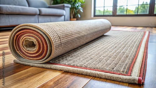 Carefully rolled out rug with edges aligned, showcasing expert technique, lies on floor, ready for installation, against a backdrop of a modern interior setting.