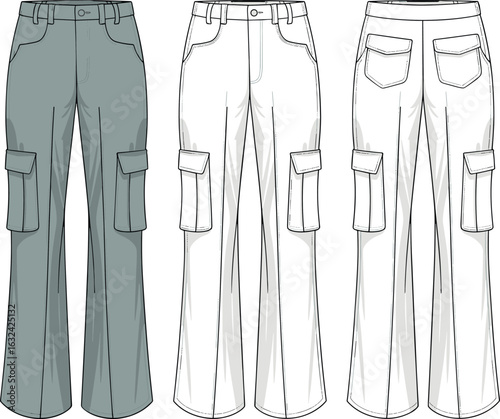 Cargo pants illustration, front and back view, button closure, belt loops, side pockets, fashion sketch, garment design, clothing template, technical drawing