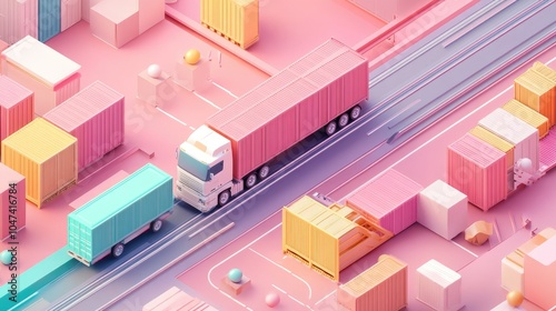 Cargo transport in import-export logistics flat design top view navigation theme 3D render colored pastel