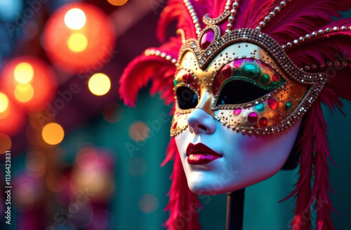 Carnival mask decorated with gold patterns and red feathers, which is associated with Venetian carnival,