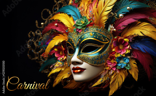 carnival poster, gorgeous gold mask with colorful feathers and luxurious decorations isolated on black background