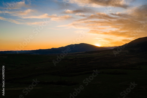 Carpathian meadow and beautiful sunset in the mountains - spring landscape, spruces on the hills, dark cloudy sky and bright sunlight, the village can be seen on the horizon.
