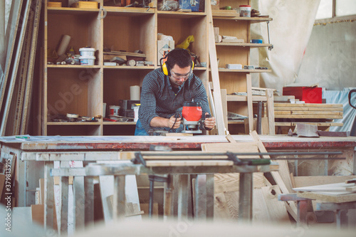 woodworker, carpenter, adult, carpenter's shop, caucasian, circular saw, craft, creativity, design, furniture, hand-made, hobby, horizontal, indoor, job, constructed, making, man, occupation, 1, people, plank, process, profession, tool, wood, wooden, work, workbench, workshop, work tool, cabinetmaker, white, male, person, adult, 30s, grown-up