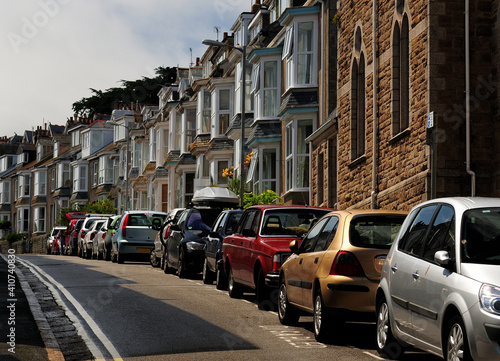 Cars Parking In Front Of Charming Row Houses At Bedford Road St Ives Cornwall England On A Sunny Summer Day With A Few Clouds In The Sky