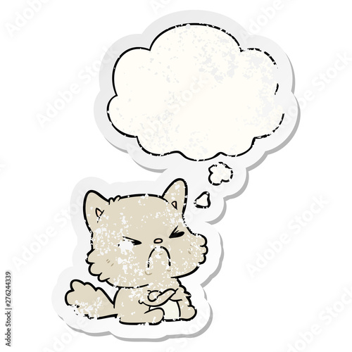 cartoon angry cat and thought bubble as a distressed worn sticker