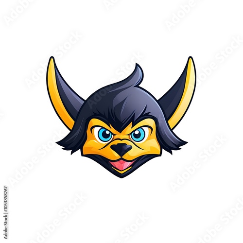 Cartoon animal mascot head with black fur, yellow ears, and blue eyes.