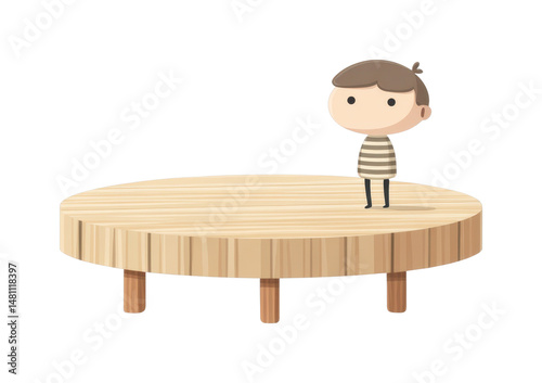 Cartoon boy figurine on wooden table platform illustration, cut out - stock png.