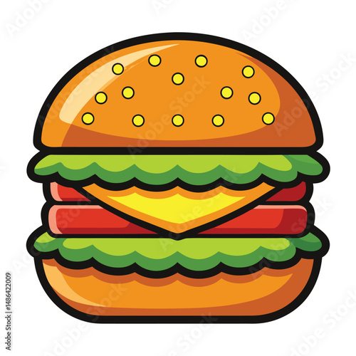 Cartoon Burger Buns with Sesame, Lettuce, Cheese, Tomato Layered and Stylized