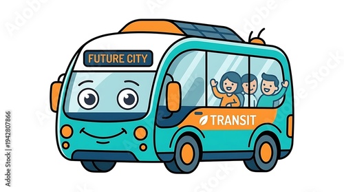 cartoon, bus, transport, smiling, face, passenger, illustration, city, travel, public, vehicle, friendly, character
