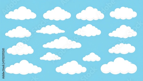 Cartoon clouds against a light blue sky. Simple, flat design. Many different shapes of clouds